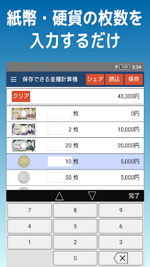 - 硬貨・紙幣の入力欄に枚数を入力していくだけの簡単操作。