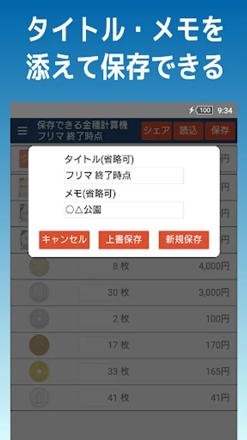 - 入力内容にタイトルとメモを添えて保存できる。(省略可能)
