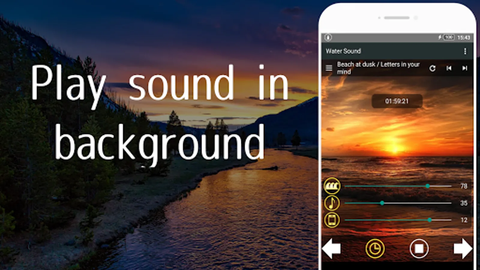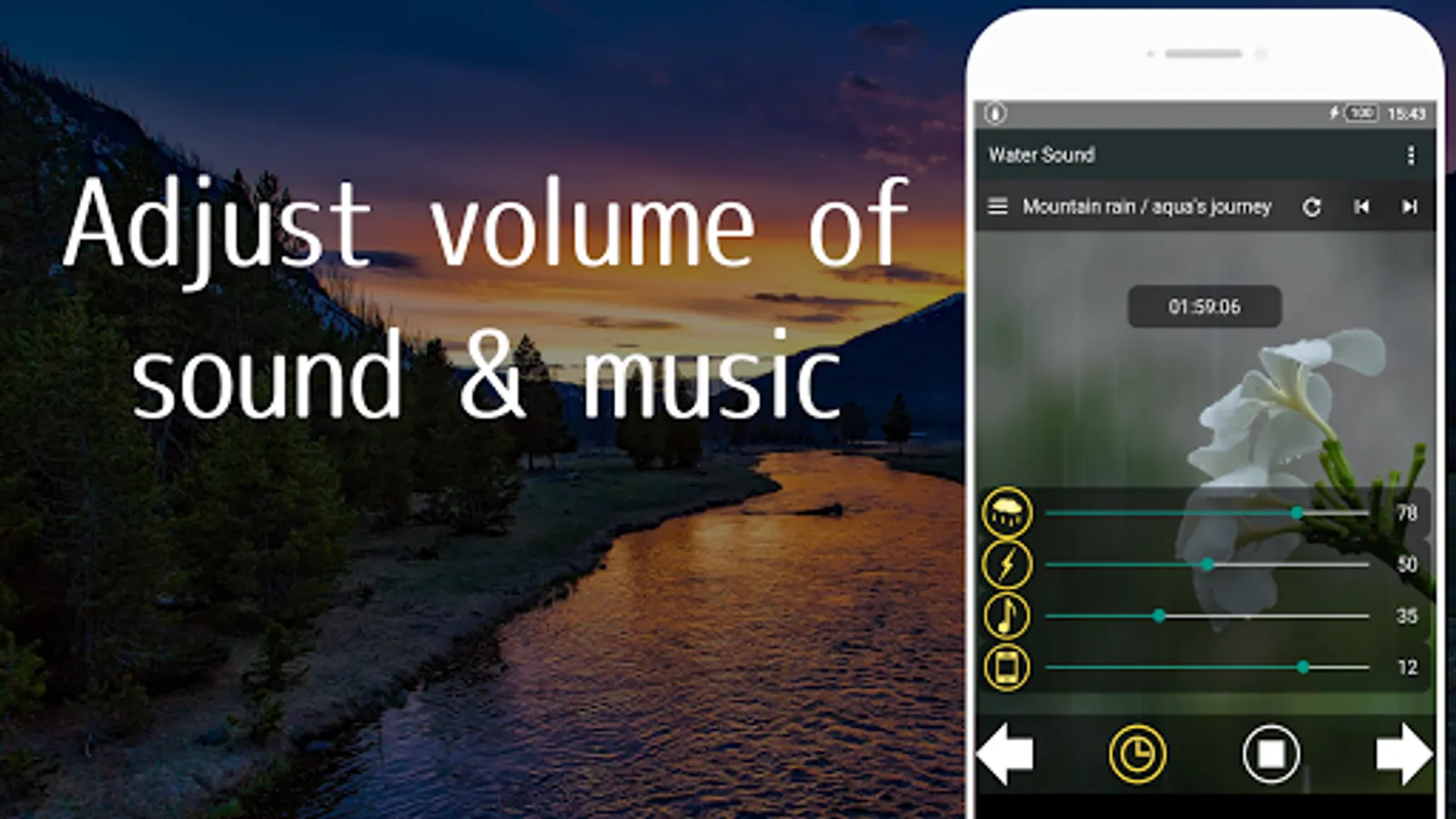 You can adjust the volume of water sound and music respectively, so you can create the ideal water sound of your choice.