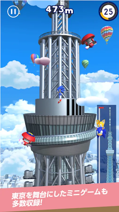 The stage is Tokyo in 2020, regain the city of Tokyo that was robbed by Eggman! Collect medals and challenge the boss while visiting tourist attractions in Tokyo! Be enthusiastic about the flashy and speedy competition that only Sonic can do!