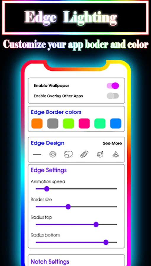 This EDGE - Border Lighting App add all awesome rounded corners light border on your phone home screen as well as lock screen. You can customize your app border according to your own choice in the application setting. You can change the edge lighting border color and design as well as speed of the lighting. We can also change notch display setting in edge lighting. Edge lighting is supportable for all types of screen in android devices. Lighting for screen infinity U shape and infinity V shape as well as infinity O type.