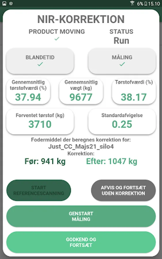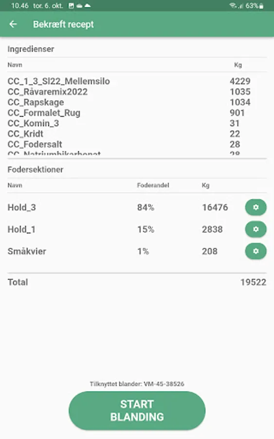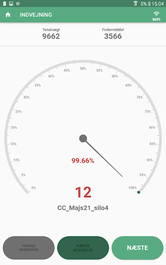 The weighing of feed is controlled on the basis of weight from the feed mixer and there is the possibility of dynamic recipe adjustment using in-line NIR. The mixer's weight is read on WiFi from the gateway mounted on the feed mixer or via API. Feeding is controlled based on weight of feed mixture in the mixer and planned distribution of the feed mixture on feeding sections.