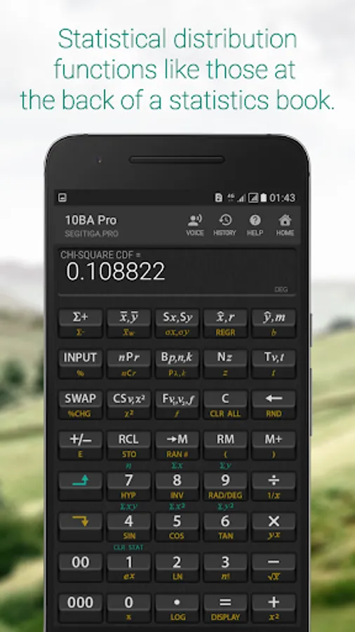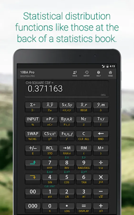 A separate screen for Statistics so many functions can be accomodated. Calculate most distribution functions that you find at the back of a statistics book!