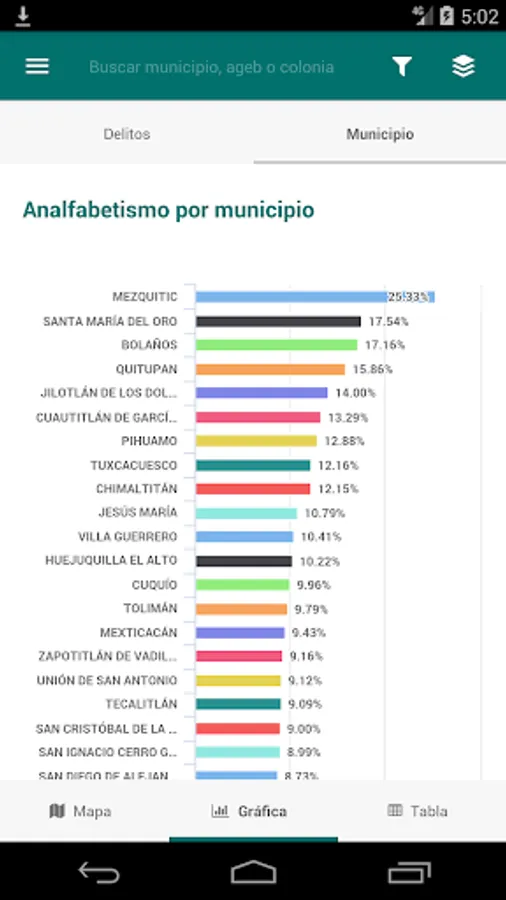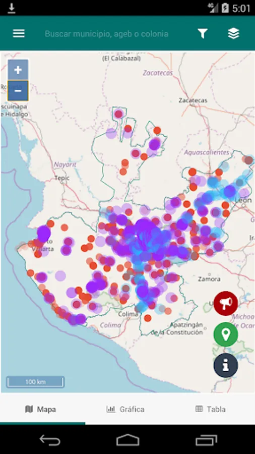 Security Map allows the query and data analysis, sufficient, accurate, timely and updated information for decision-making on security, marginalization and poverty, allowing different stakeholders such as the authority, researchers, media media, non-governmental organizations and the general public, access, share and exchange information in different coverages of the State of Jalisco, such as: Municipalities, AGEBS and colognes.