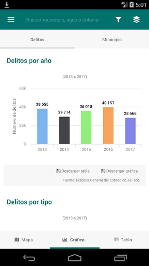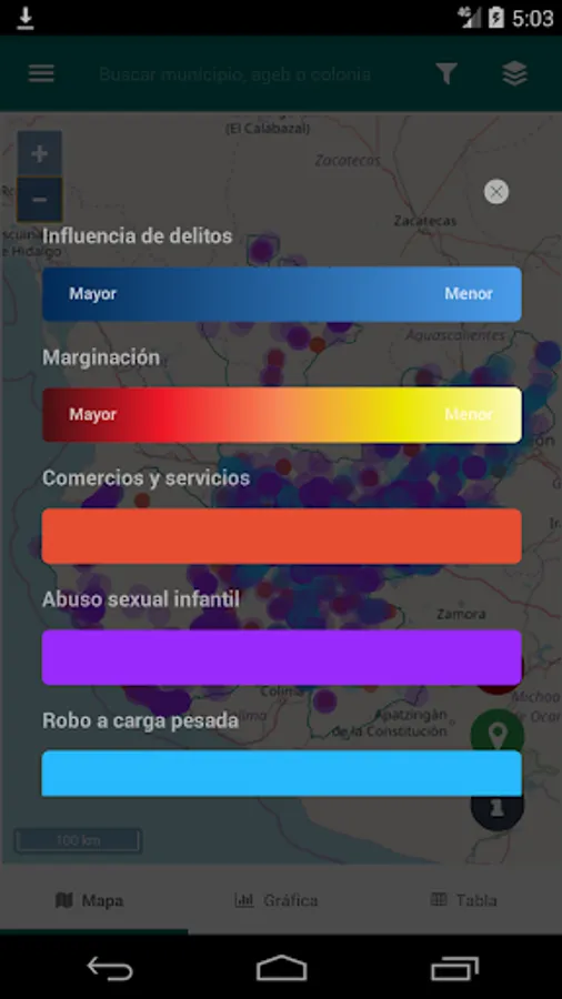The application integrates databases crimes of the Attorney General, geographic-statistical information from Statistics and Geographic Information and INEGI, which are represented on maps, graphs and tables.