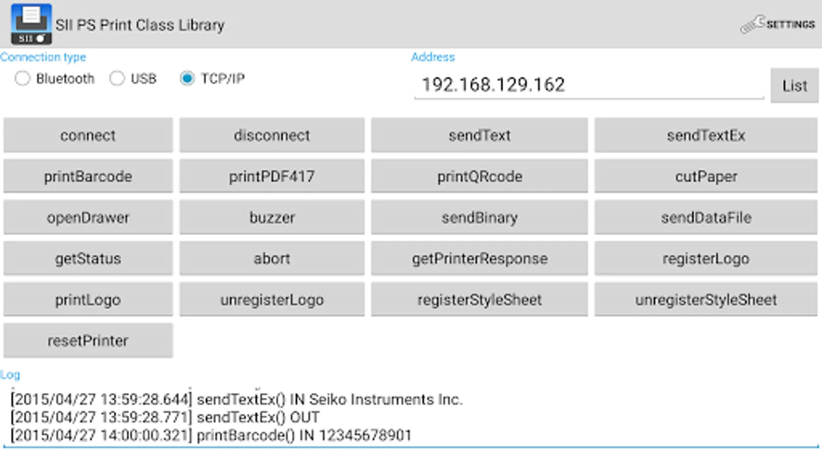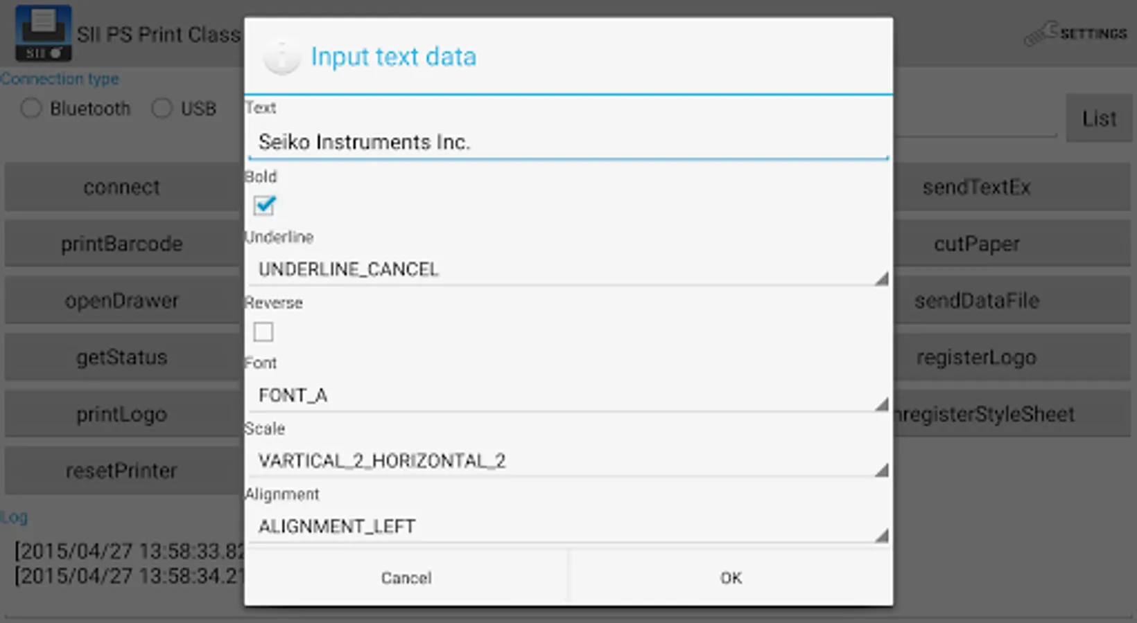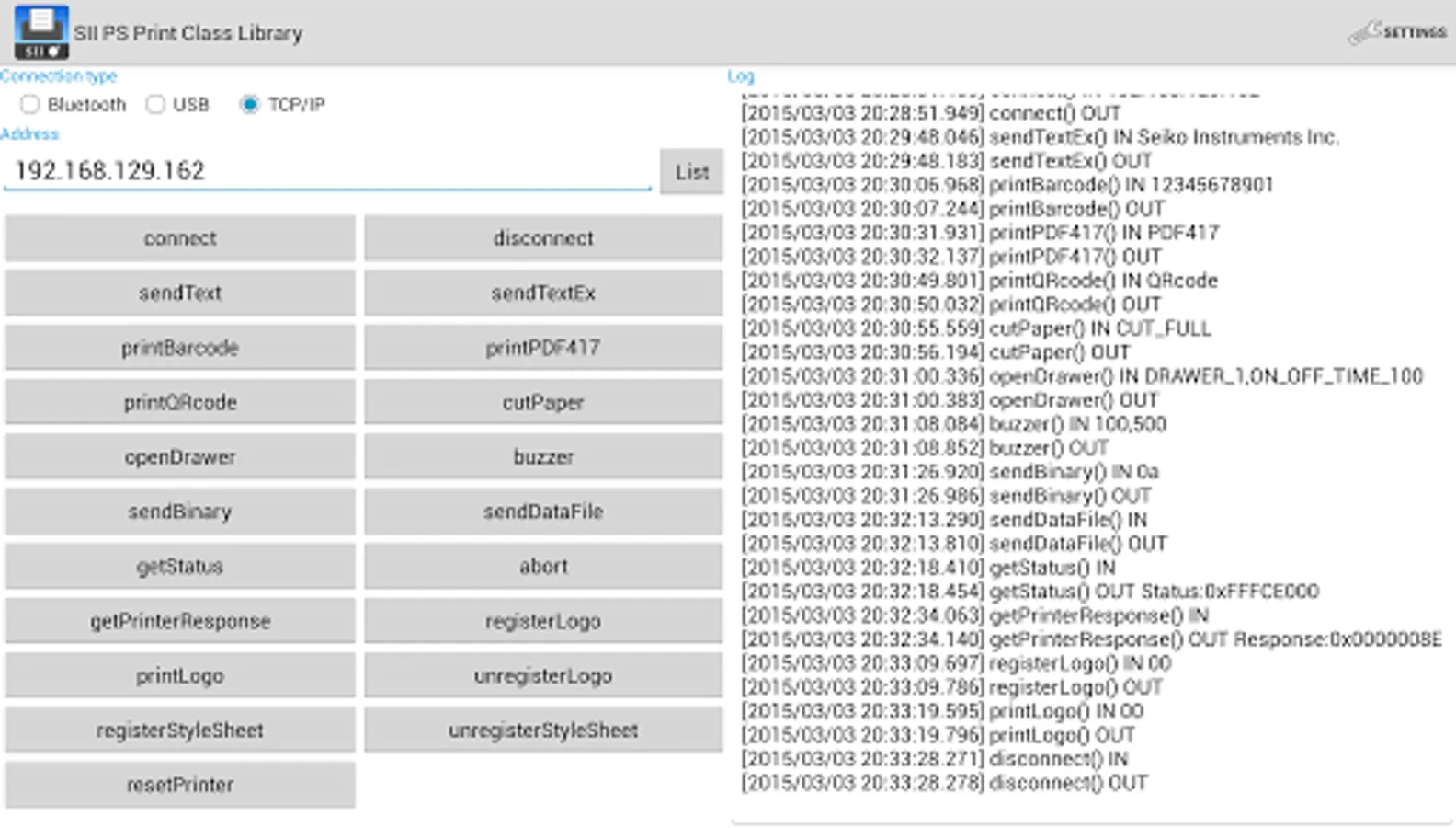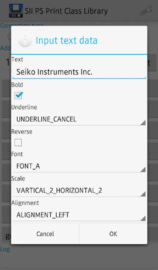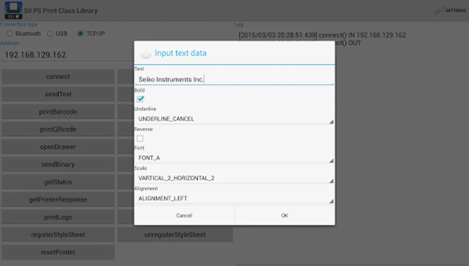 This app allows you to print text or barcode to Seiko Instruments Inc.'s(SII) printer using the Print Class Library provided by SII.