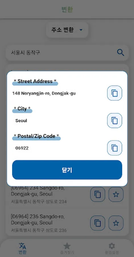 Hangul name and address according to the current Romanization method (Ministry of Culture and Tourism Notice No. 2000-8)
