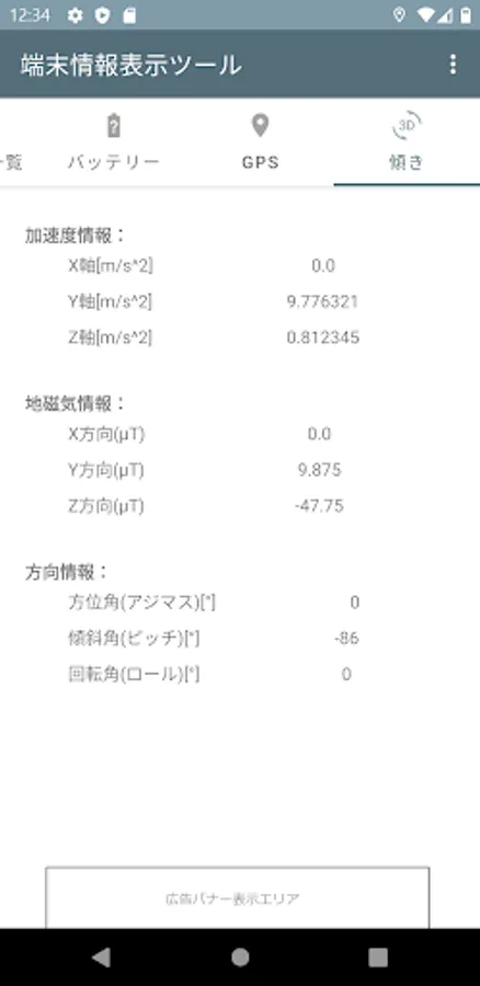 The direction information (tilt) of the device is displayed using the acceleration information and geomagnetic information of the Android device.