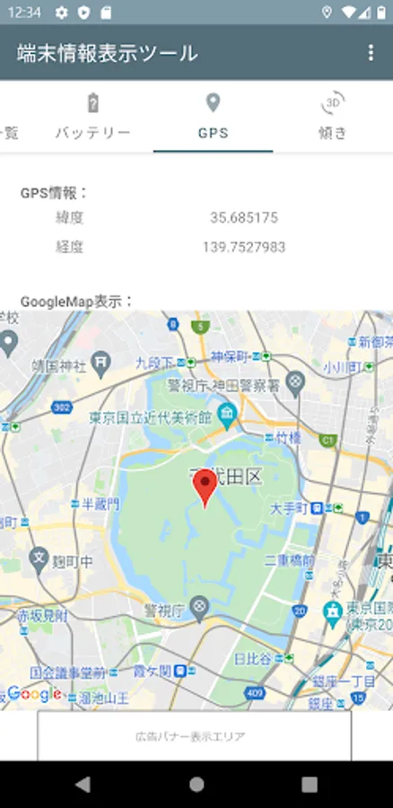Displays the location information (latitude, longitude) acquired by the GPS sensor of the Android device. You can also visually check the location information on Google MAP.