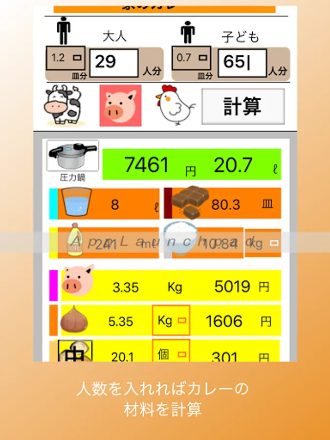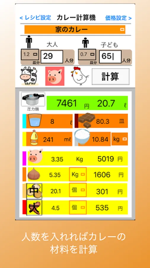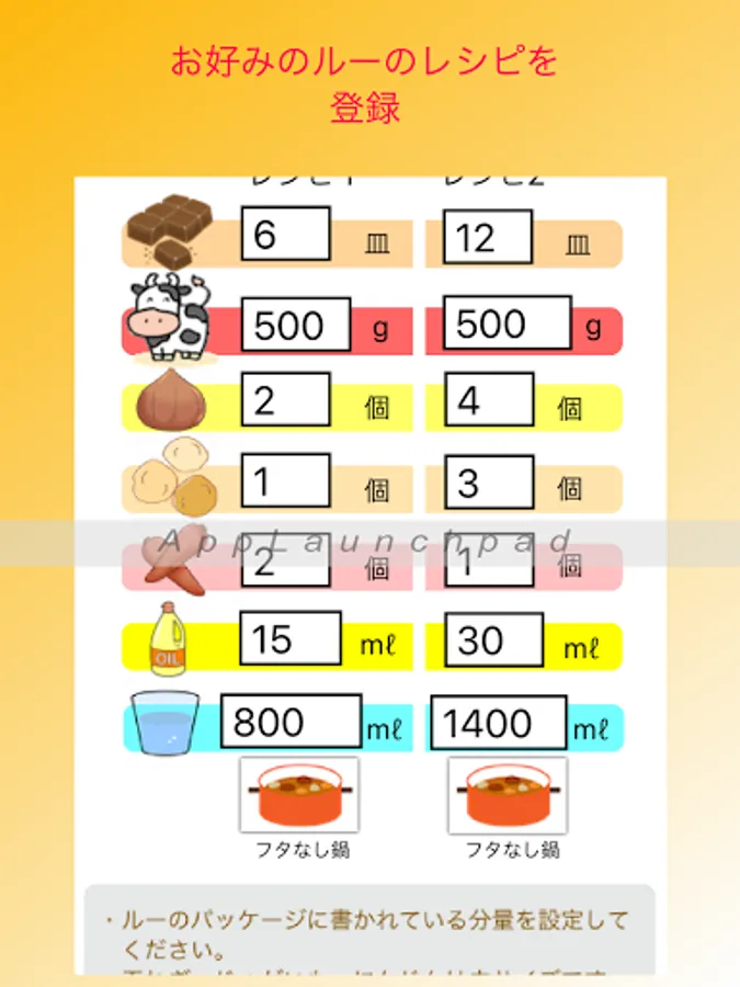 * Register recipes and easily calculate the ingredients for curry for the required number of people.