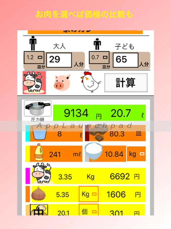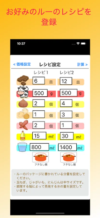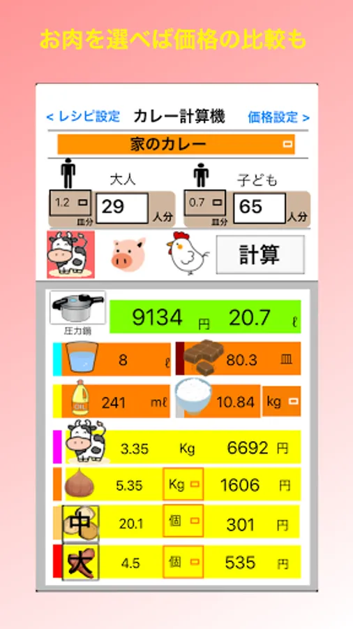 "Curry calculator" can know the necessary ingredients, amount of water, amount of rice, etc. just by entering the number of adults and children. You can also register recipes according to the type of roux.