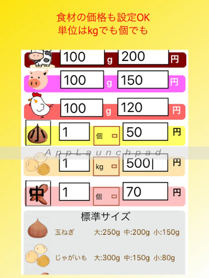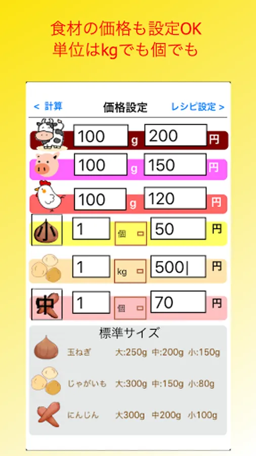 -You can switch the display of the amount of onions, potatoes, and carrots between "individual" and "Kg".