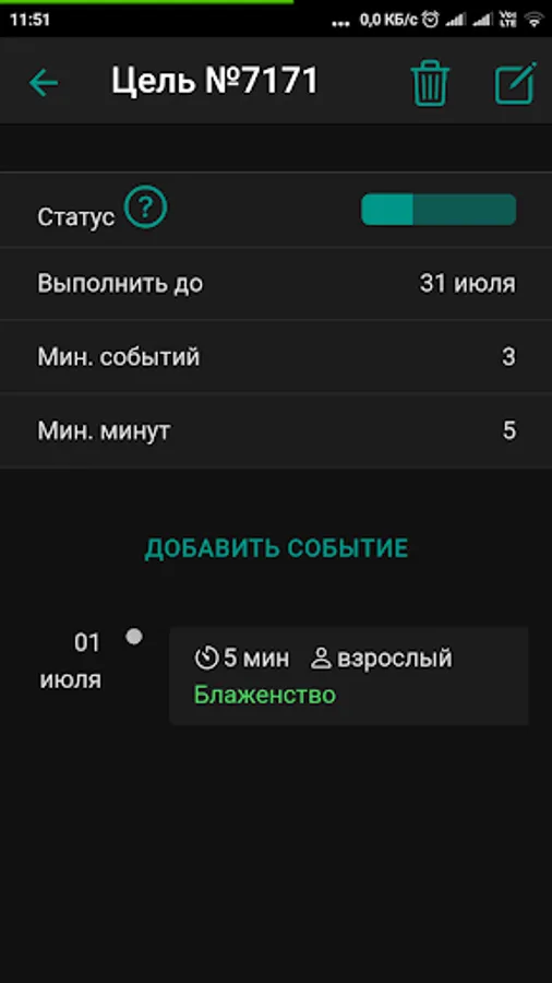 The goal is considered complete if you completed the minimum number of events taking into account their minimum duration, and also in each event were in the role of "adult" and did not experience negative feelings.