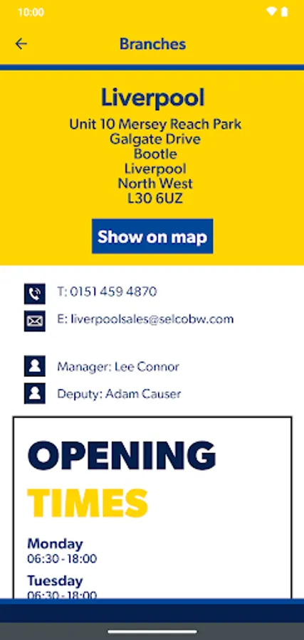 Simply opening the app will provide details of the nearest Selco branch to where you are at that particular moment. You can also search for a branch using postcode or place name and see a list of all our branches ordered in distance from your location