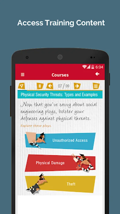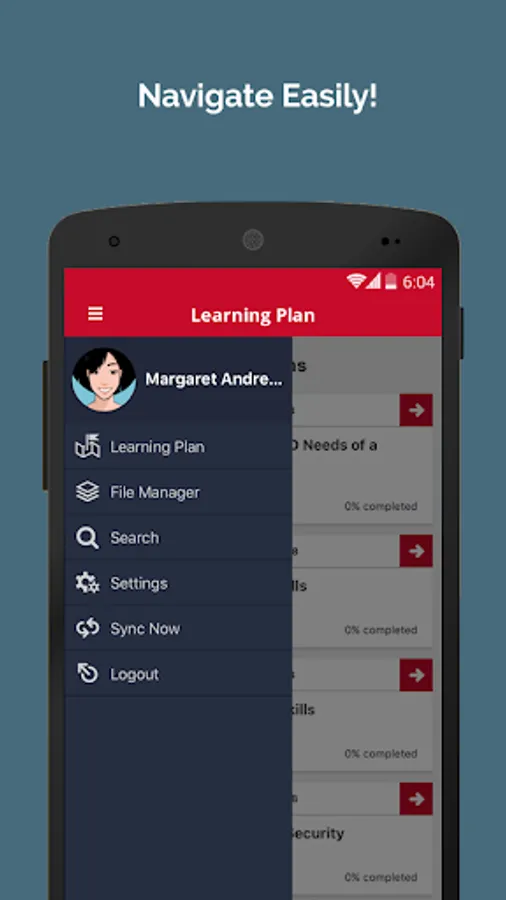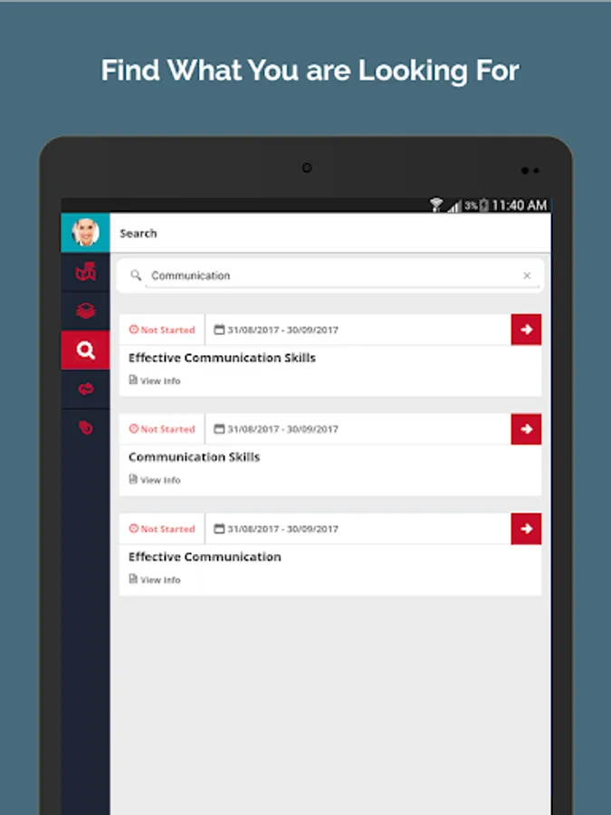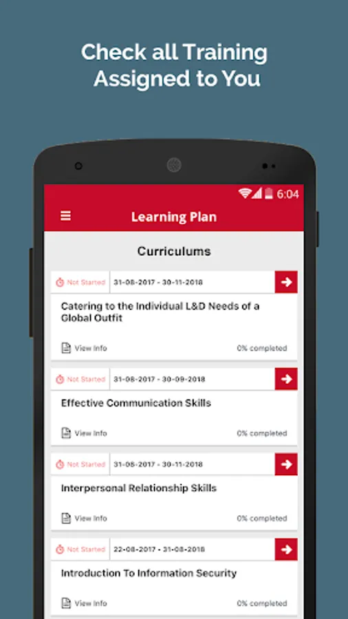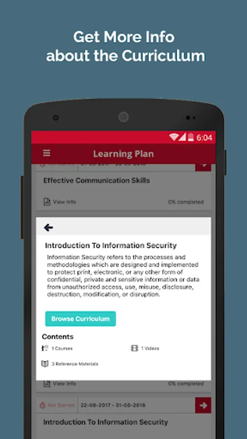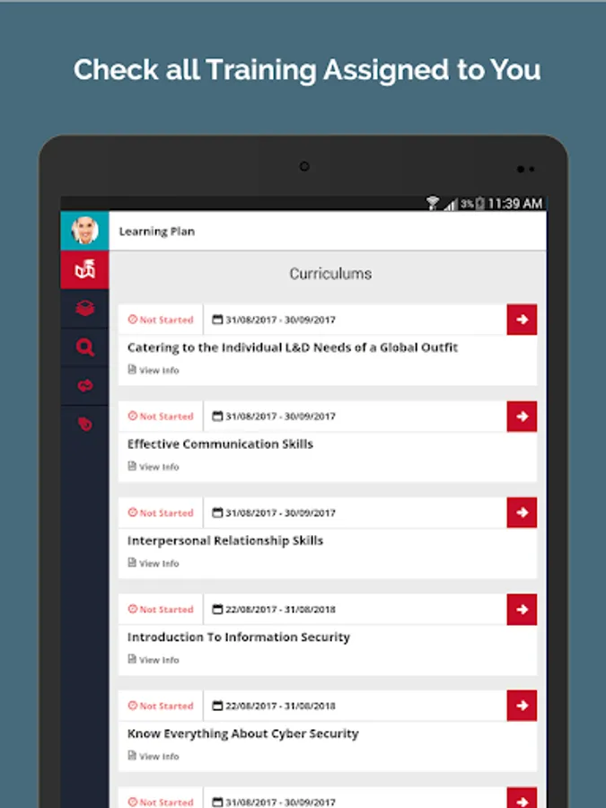 Learners can access (uploaded) Videos, Courses (SCORM 1.2 and HTML 5) and Reference Materials (Documents, Presentations, Images) through the app.