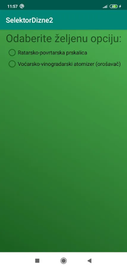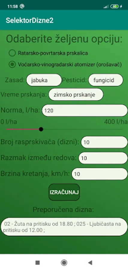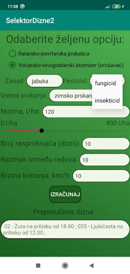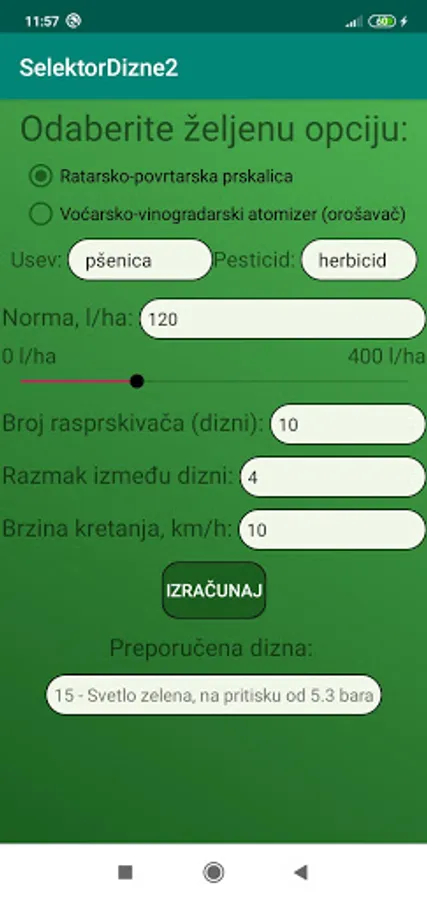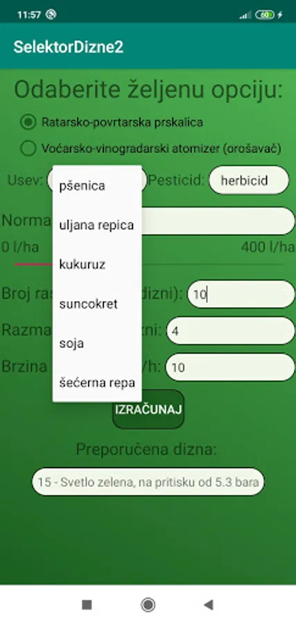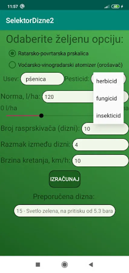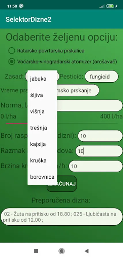 Na osnovu unetih podataka (vrsta useva, vrsta pesticida, norma, itd), aplikacija će izvršiti proračun i ponuditi korisniku rasprskivač koji je najpogodniji za njegove potrebe.