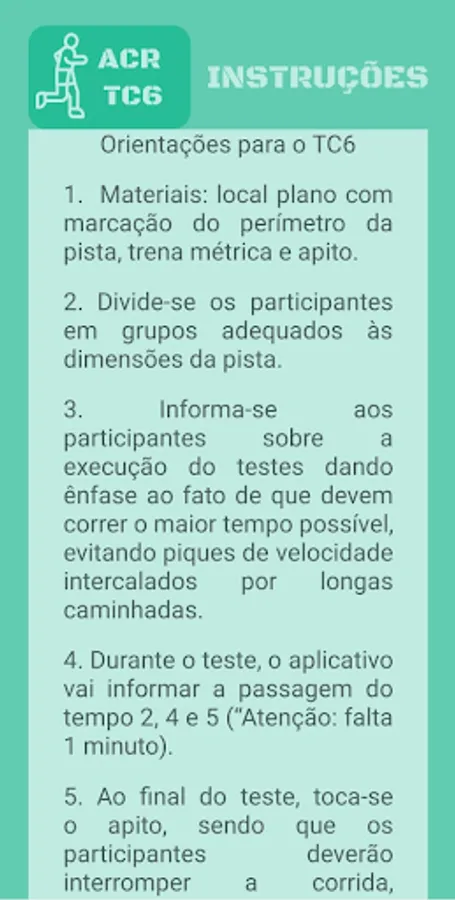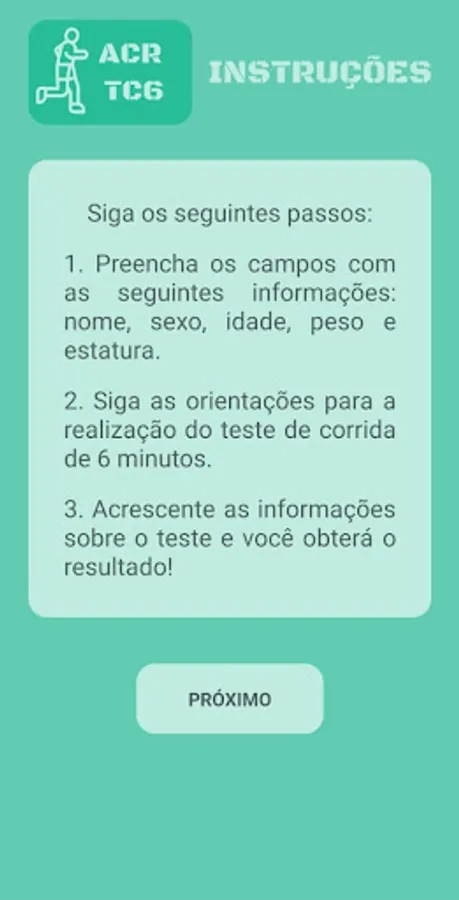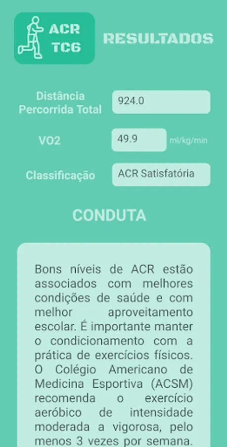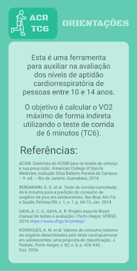 This application is a product of the Postgraduate Program in Primary Health Care: Professional Master in Primary Health Care at the State University of Montes Claros - UNIMONTES. It is the result of a dissertation by Sélen Jaqueline Souza Ruas, supervised by Professor Dra. Maria Fernanda Santos Figueiredo Brito and co-supervised by Dra. Josiane Brant Santos Rocha and Dra. Lucinéia de Pinho. It is a tool to help assess the levels of cardiorespiratory fitness of people between 10 and 14 years old. The evaluation starts with the 6-minute running test (6MWT) and, based on the test performance, sex and body mass index, the maximum VO2 is calculated. The result is presented with the classification of the level of cardiorespiratory fitness: satisfactory or unsatisfactory and followed by suggestions for physical exercises proposed by the American College of Sports Medicine.