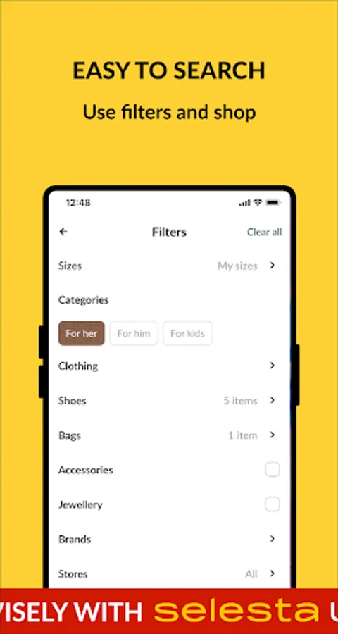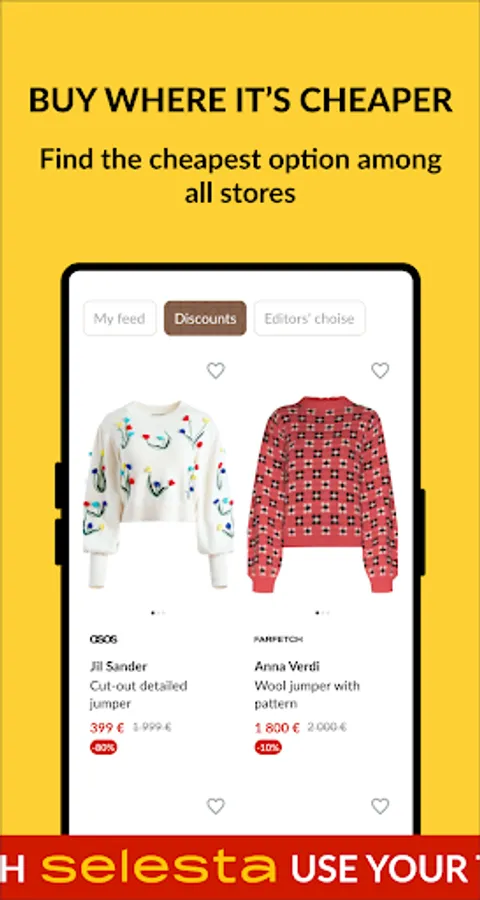 Looking for a digital luxury fashion assistant that can revolutionize your online shopping experience? Look no further than Selesta! Our shop app simplifies and enhances the process of finding fashionable products from online shops worldwide. With aggregated information on clothing, shoes, accessories, beauty, and luxury goods, you can save time and find the best deals on the products you love. Say goodbye to the hassle of downloading multiple luxury brand shop apps and hello to a personalized approach that makes you feel like a private client. With express delivery, fast returns and refunds, and free fittings from our partners, Selesta is the ultimate shop app for luxury fashion-savvy shoppers. Try it today and see why Selesta is the future of online shopping!