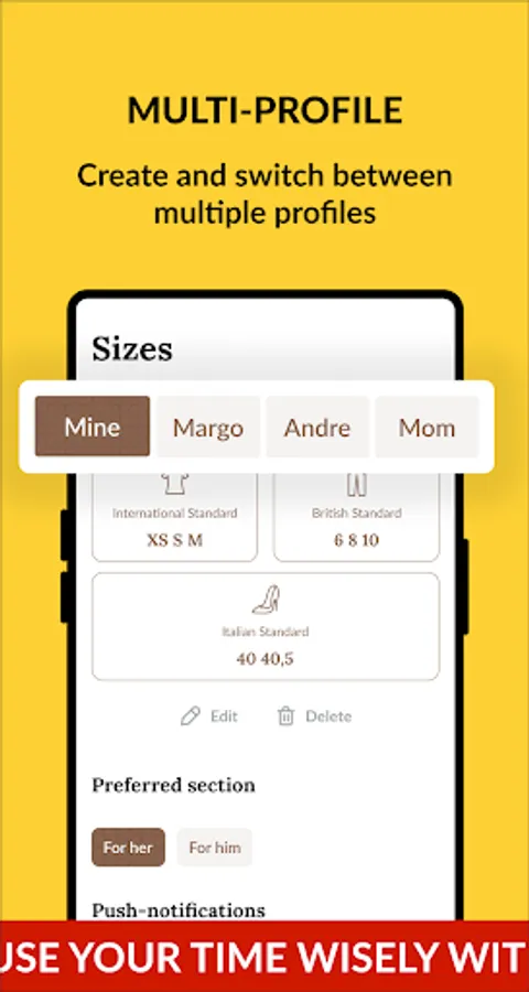 Don't waste time looking for a T-shirt for your loved one. Create multiple profiles and save sizes. Simply switch between profiles. Shop it!