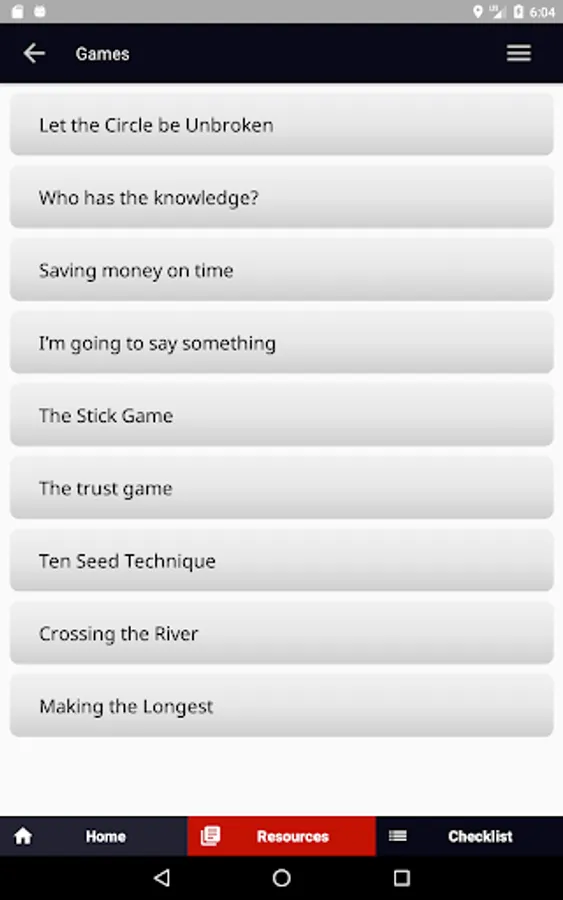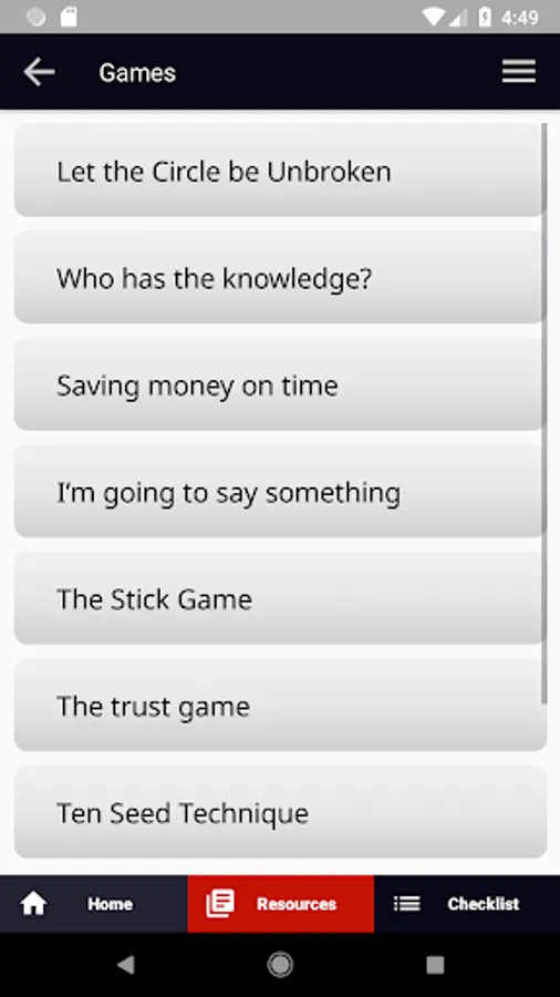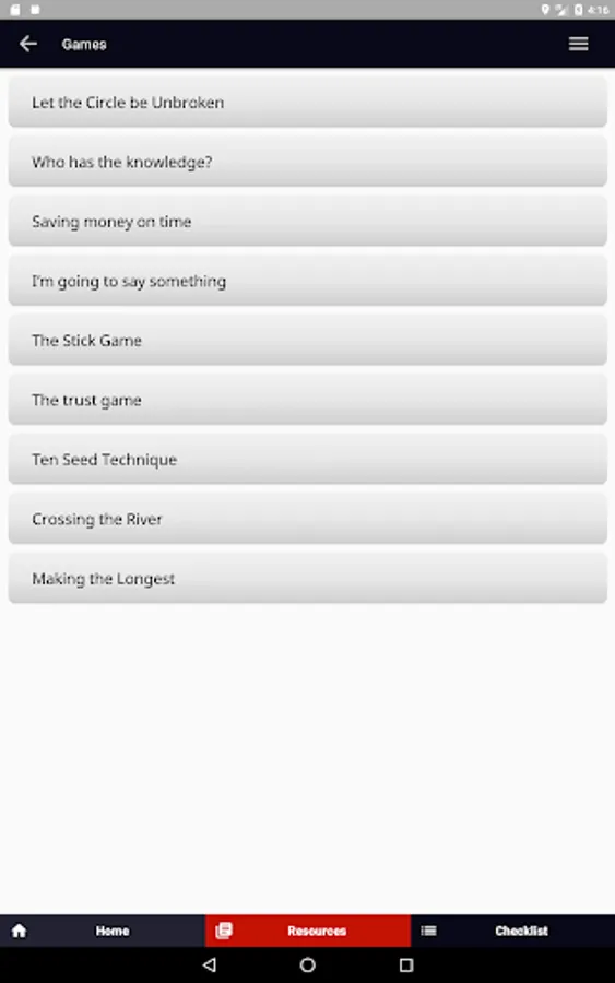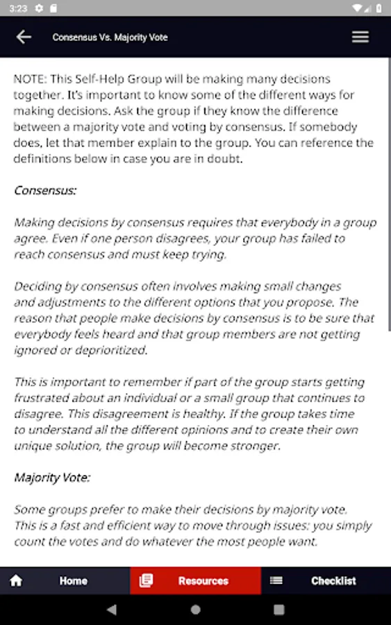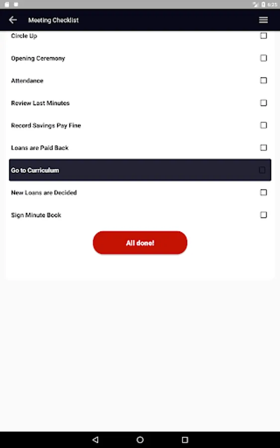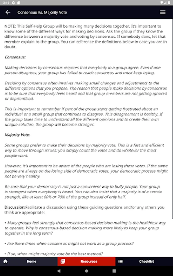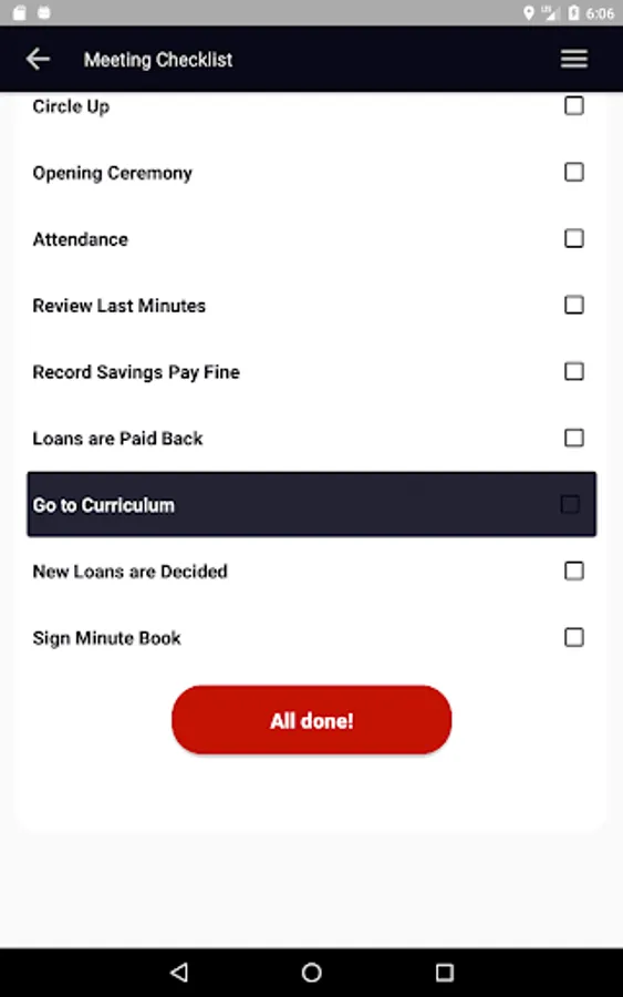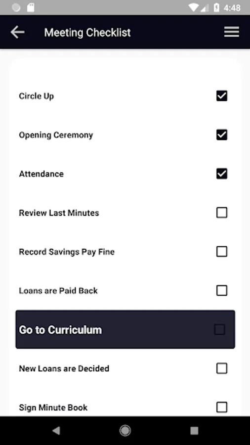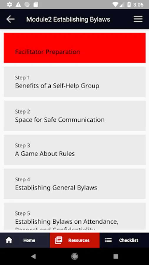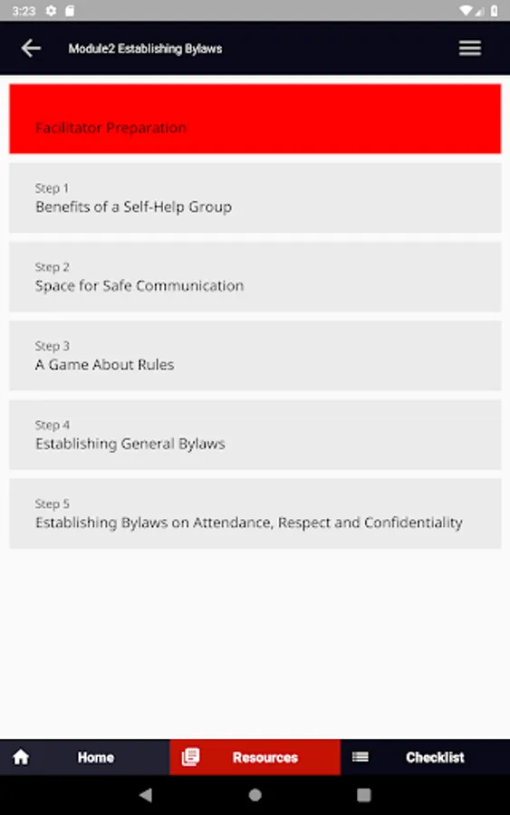 Facilitators can log in using "facilitation mode" or "group mode." In "group mode," the app bookmarks where in the curriculum a meeting ended and resumes there the next time the group logs in.