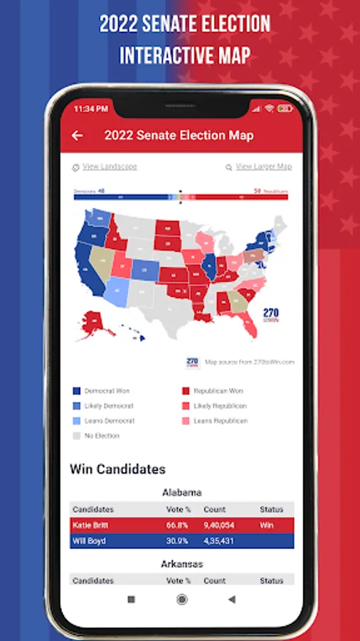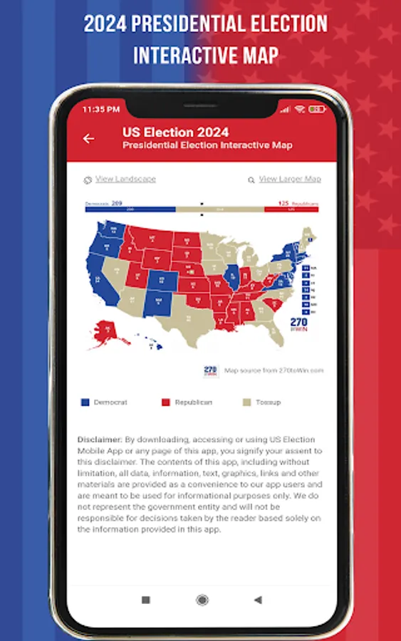 Disclaimer: By downloading, accessing or using US Election Mobile App or any page of this app, you signify your assent to this disclaimer. The contents of this app, including without limitation, all data, information, text, graphics, links and other materials are provided as a convenience to our app users and are meant to be used for informational purposes only. We do not do not represent the government entity and will not be responsible for decisions taken by the reader based solely on the information provided in this app.
