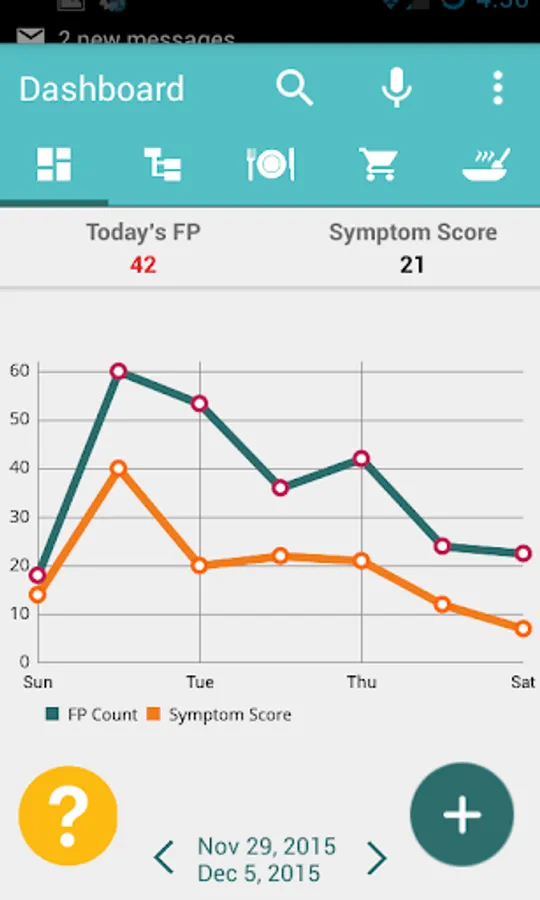 This is where you start. The graph is automatically generated based on your meals (FP) and symptoms. You can see it either by week or month to track your progress on symptom relief over time.