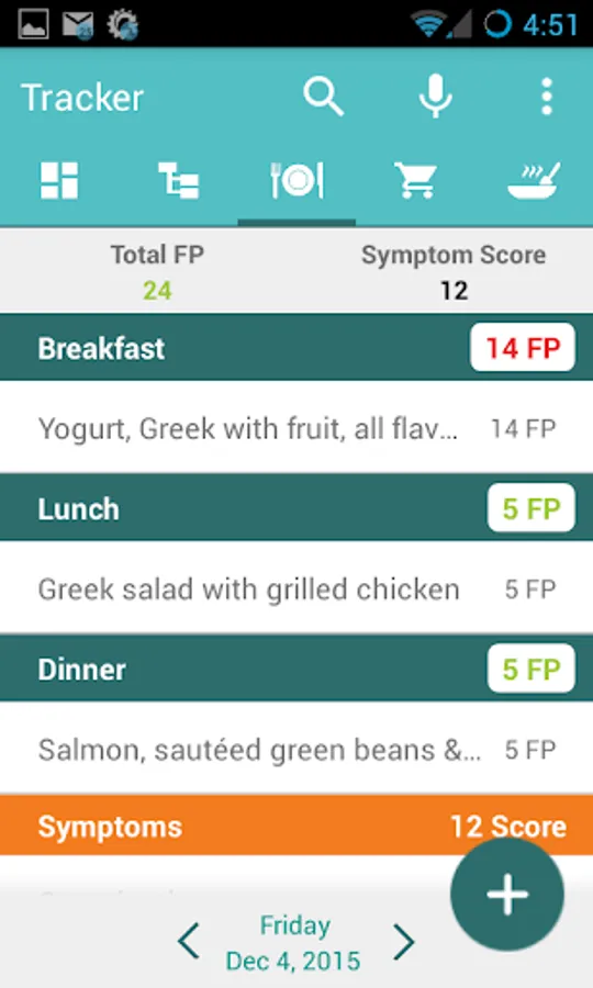 Your meals and symptoms are logged here. You can log meals and symptoms from the Dashboard, FP Food List as well as within the Tracker.