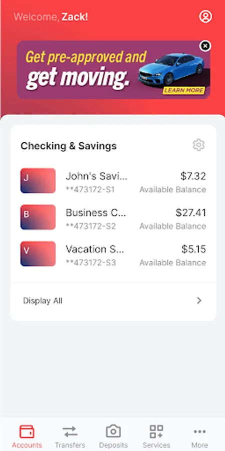 - Transfers: account to account, scheduled, pending ACH and check withdrawal transfers available