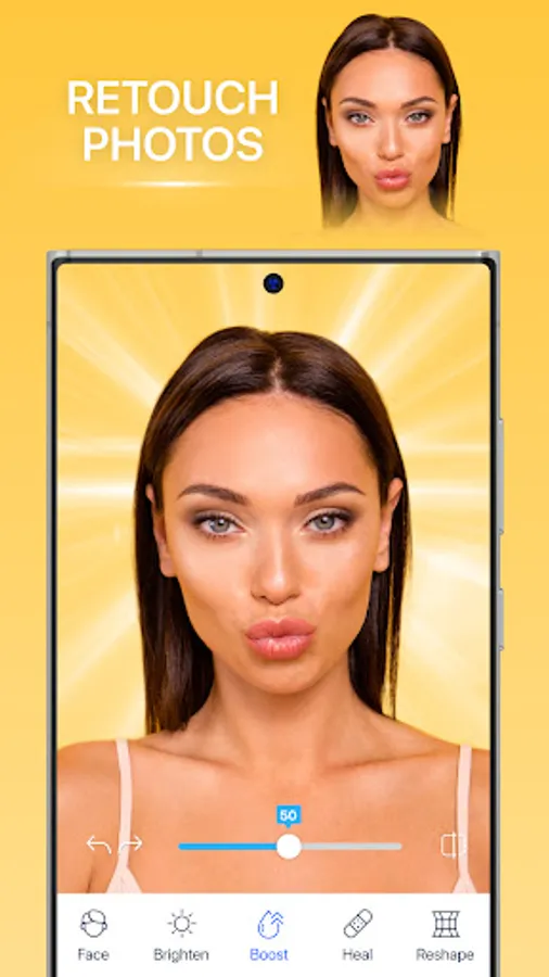 You can retouch your photos using our advanced technology to get smooth skin and white teeth. Easily remove eye bags, blemishes or any other unwanted elements from your photos. Share your photos, creatively express yourself and impress your followers. Getting the perfect shot for your social media accounts has never been easier!
