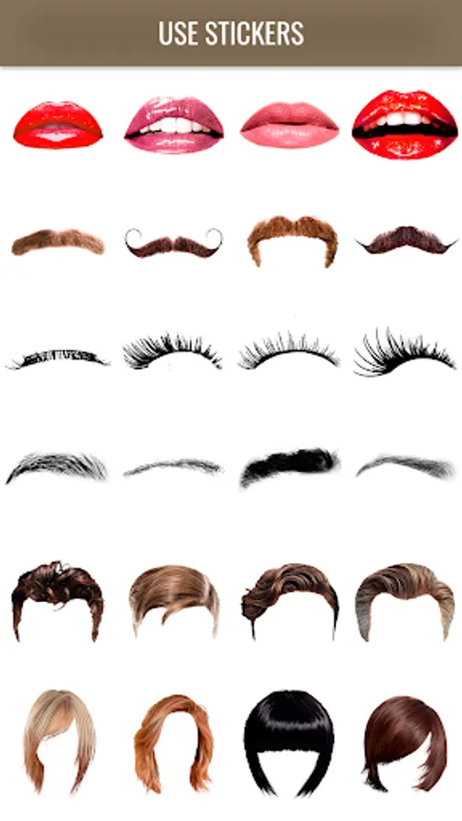 Our fun app will help you transform into a real girl or tough guy. Increase lips, change women's hairstyles, stick eyelashes and eyebrows. Or grow a beard, try on a mustache and a variety of male hairstyles. Save the photo and share it with your friends.