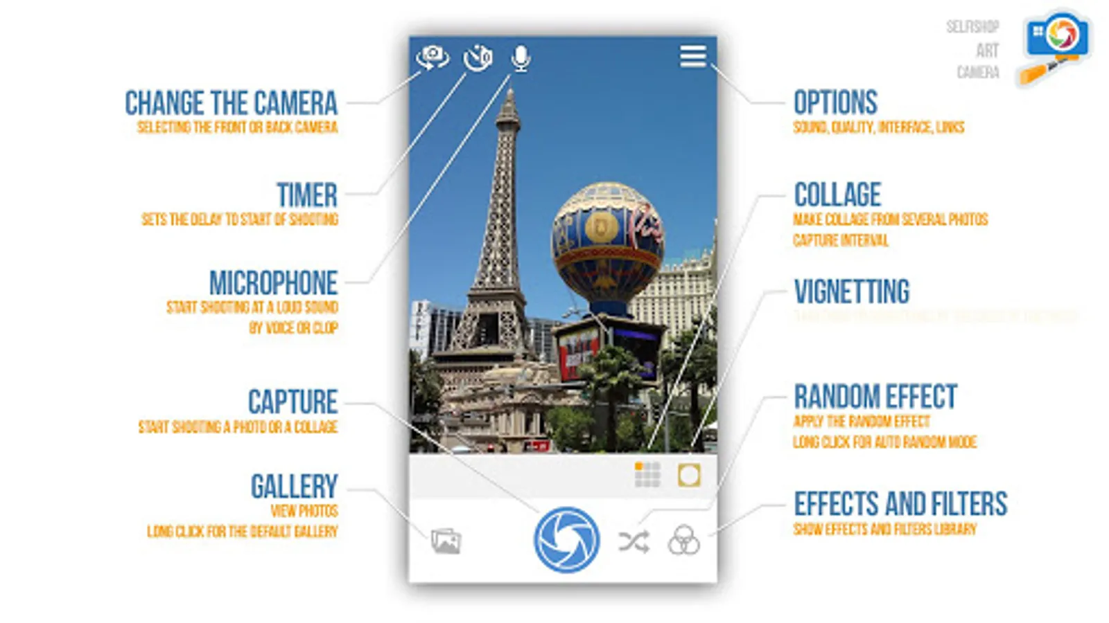 Tired of boring pictures? Take stylish glamorous and beautiful photos with our new program Selfishop Art Camera! Color effects will make your pics irresistible. Filter and collages in real time will give your photos unforgettable emotions!