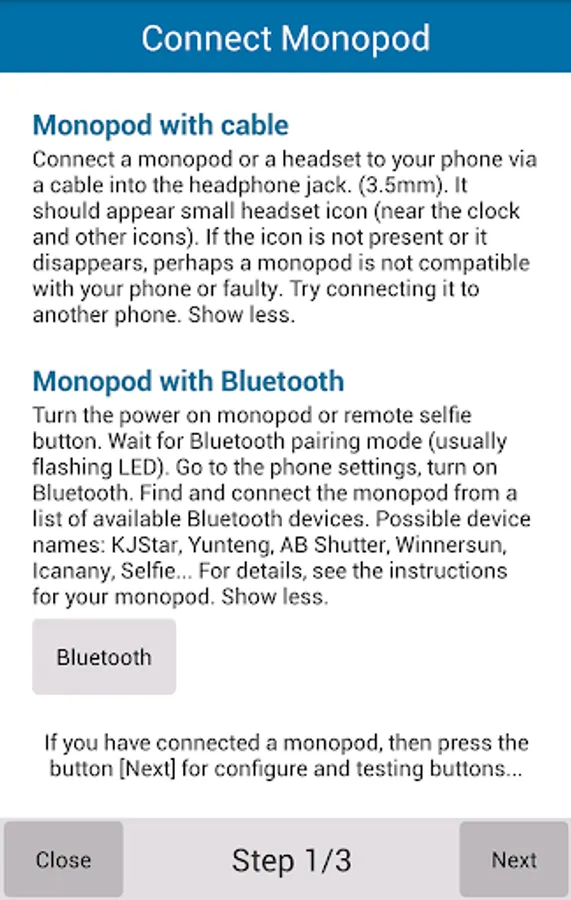 Cable monopods can be not compatible with your smartphone. If monopod is not compatible with your smartphone, then, unfortunately, no program can help in connecting monopod to smartphone.