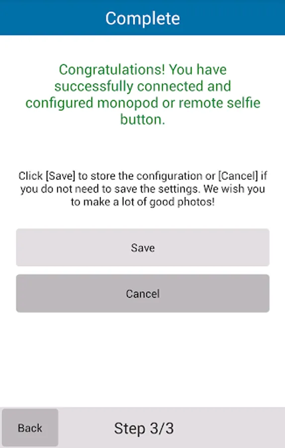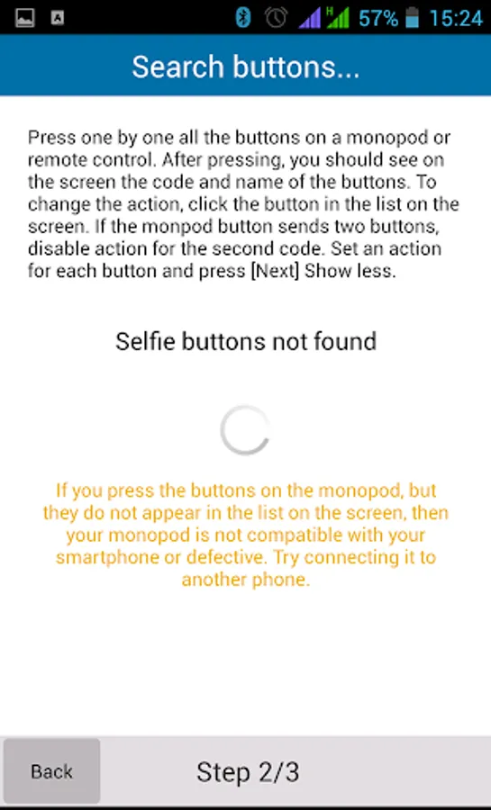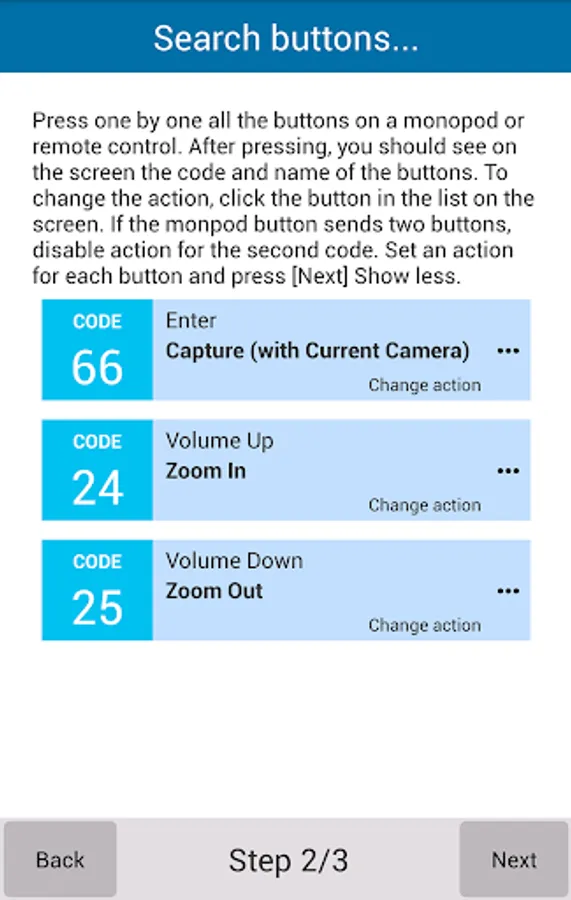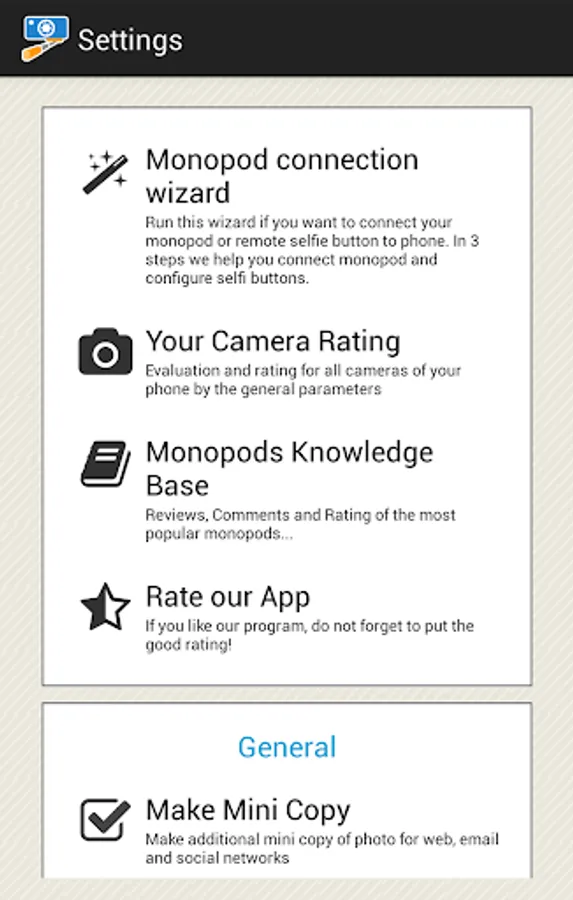 Selfie Camera for the most popular tripods and selfiestick monopods with bluetooth buttons or cable. Now you can press the monopod button and take pictures on your phone. If your monopod has a few buttons, you can adjust the action for each button (Capture, Zoom, Change camera...). Just run "Monopod Connection Wizard" from options. For advanced users, there is a window for the research commands received from the monopod. Of course the program can be used as a camera without a moopod. Photo shot can be done by tapping the screen or on the volume button.