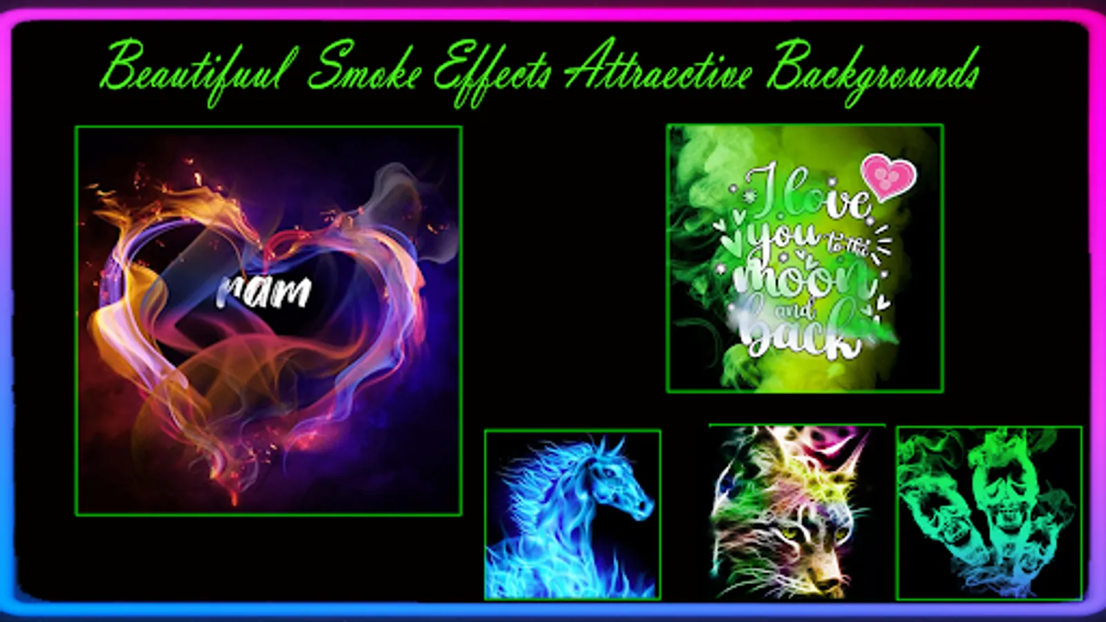 Smoke Effect Name Art that you can decorate it with different decorative item as feathers, love items, art item, love stickers, color brush, Deferent Frames, heart shapes.
