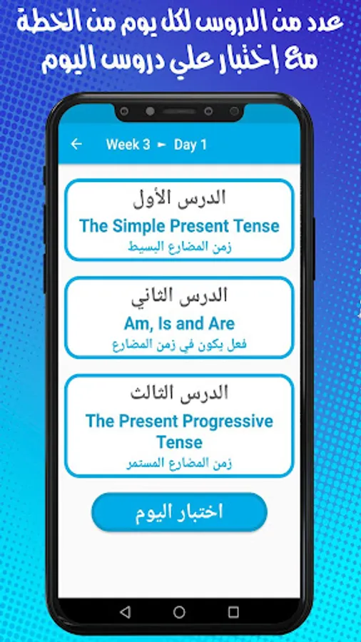 - كل يوم من أي أسبوع يحتوي علي عدد من دروس اللغة الإنجليزية و يوجد إختبار في نهاية كل يوم لتحديد مقدار استيعابك لدروس اليوم. و يوجد إختبار شامل في نهاية الخطة يشمل الـ12 أسبوع.