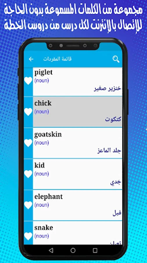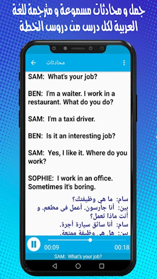 - داخل كل درس مجموعة من الكلمات المسموعة بدون الإتصال بالإنترنت و مجموعة من الجمل و المحادثات (تحتاج لإنترنت).