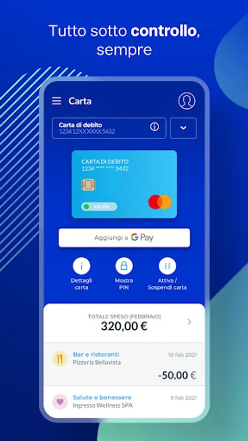 • Manage all your accounts and cards directly from your smartphone. You can view your card PIN, you can temporarily suspend your cards and top up your prepaid card.