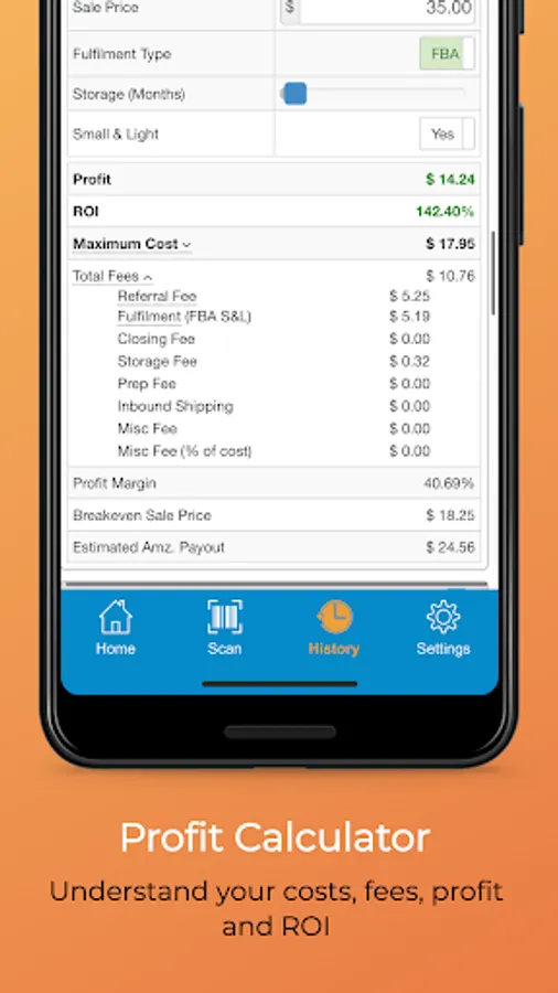 - Instantly calculate ROI, profit, profit margin, break even sale price, etc.