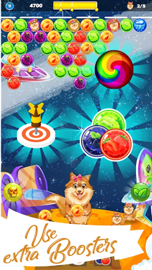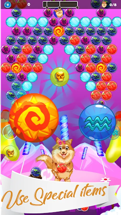 - Match 3 bubbles or more of the same color to save the puppy and win points.