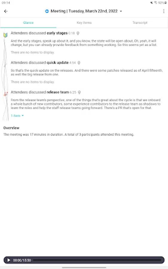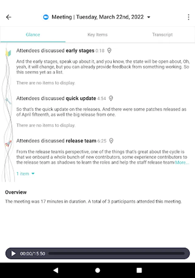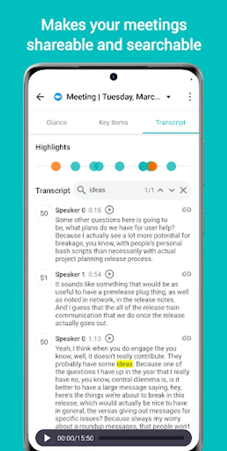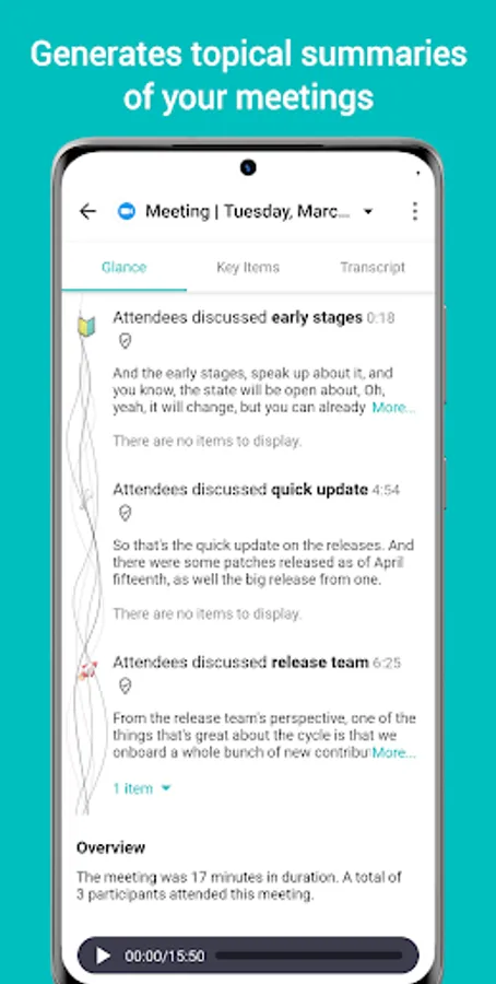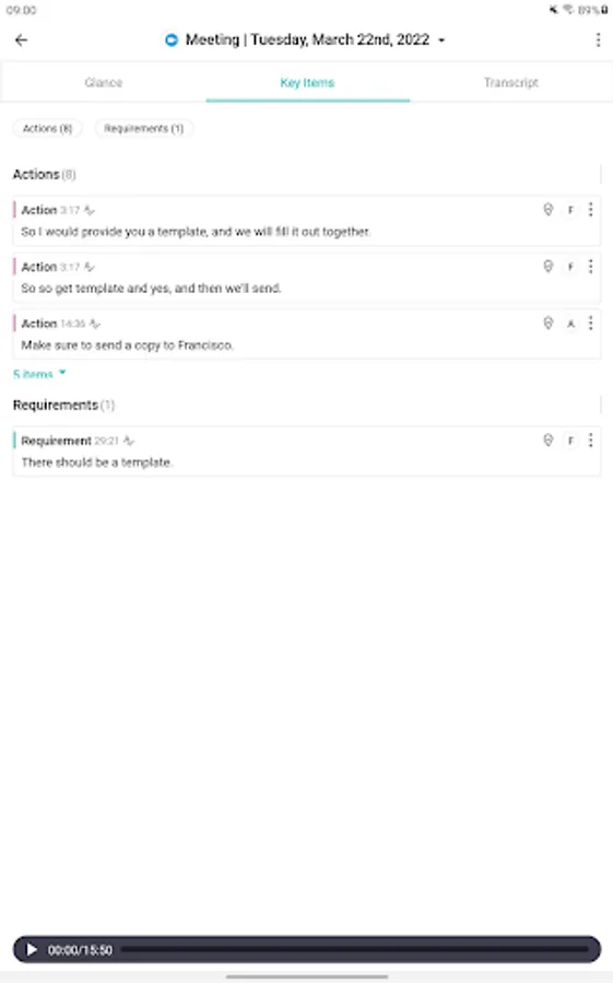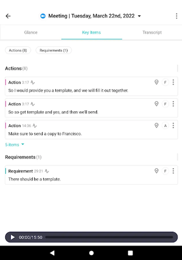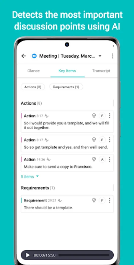 Record meetings from your phone or upload audio files to get insights including sentiment, decisions, actions, issues, risks, events, and more.