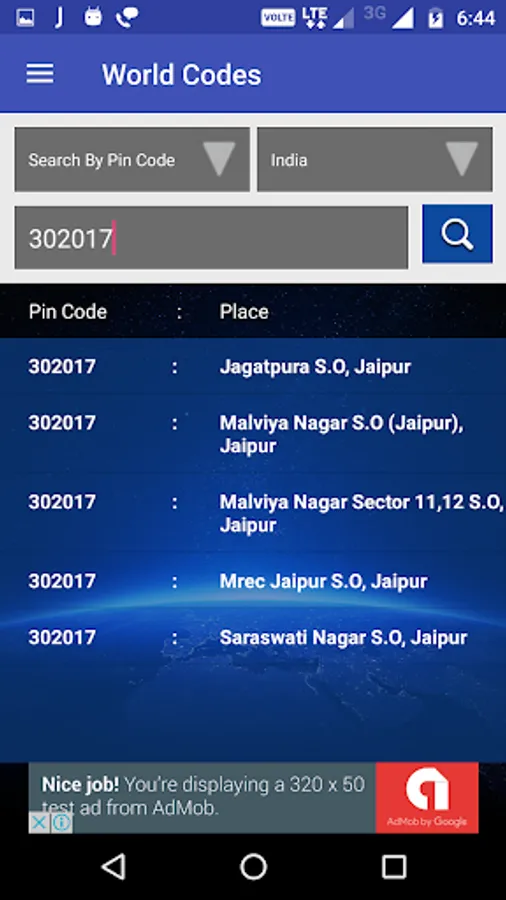 World codes is a simple place finder app that works intense for any local destination. Find basic demographic data about a place through pin code or putting destination name. Enhance knowledge about a specific area via “world codes” where we find place’s subordinates like division name, state name, circle name, region name, head office etc.