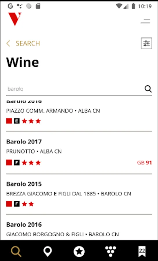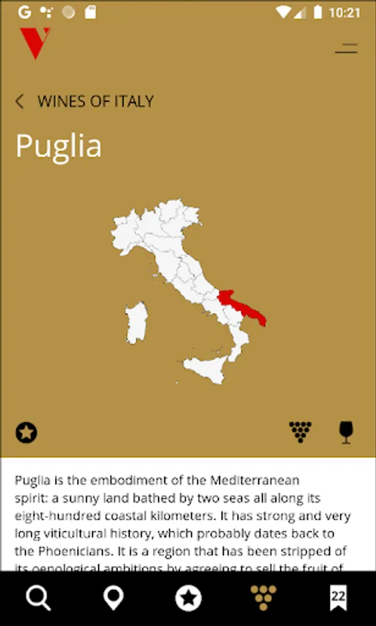 Furthermore, the app offers a renewed version of its classic features, such as FIND THE WINE, FIND THE PRODUCER, PRODUCER OF THE DAY, THE AWARDS and WINES OF ITALY. In addition to that, the app's graphics and user interface have been profoundly renewed with the introduction of new filters and an accurate geolocation service that will allow the user to explore and discover the Italian wine heritage quickly and intuitively. Those features provide effective support both to the consumer and the professional in the purchase process and an essential guide for wine tourists visiting the wine districts of Italy. The WINES OF ITALY section guides the readers across every region, from the north to the south of the peninsula, through a focus on local wines awarded with the Three Gold Stars, descriptions of the reviewed producers (listed in alphabetical order), and a selection of the Finest Drinking Places (208 restaurants and wine bars that take great care with their oenological offer).