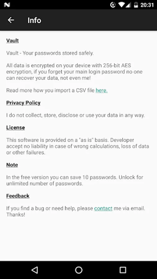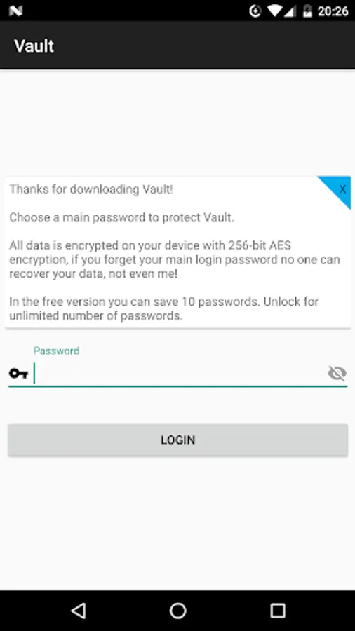 Vault manages all your passwords easy and safe. All data is secure encrypted on your device with 256-bit AES encryption, if you forget your main login password no one can recover your data, not even me!