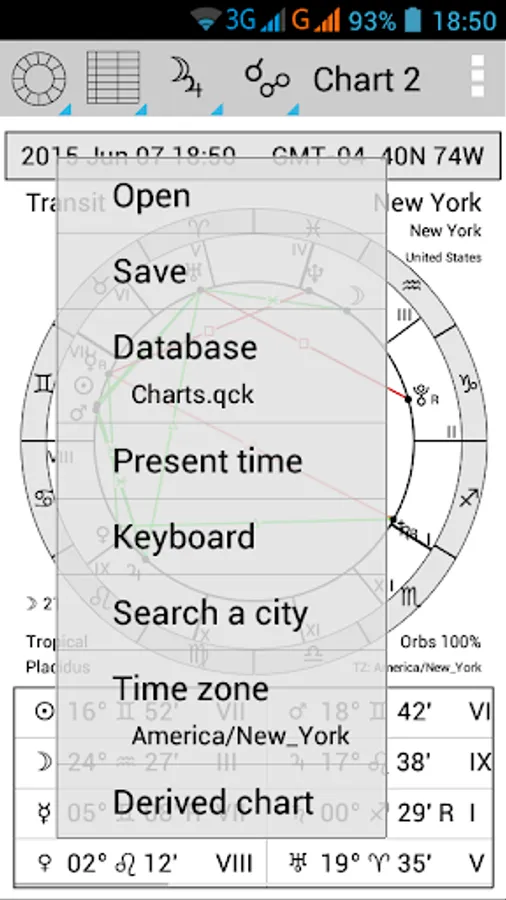 - It is possible to save and to open charts. Databases in the format of QuickChart and ZET are supported. Create a folder named "astrodata" on SD-card, and put there the database files (*.qck and *.zbs).