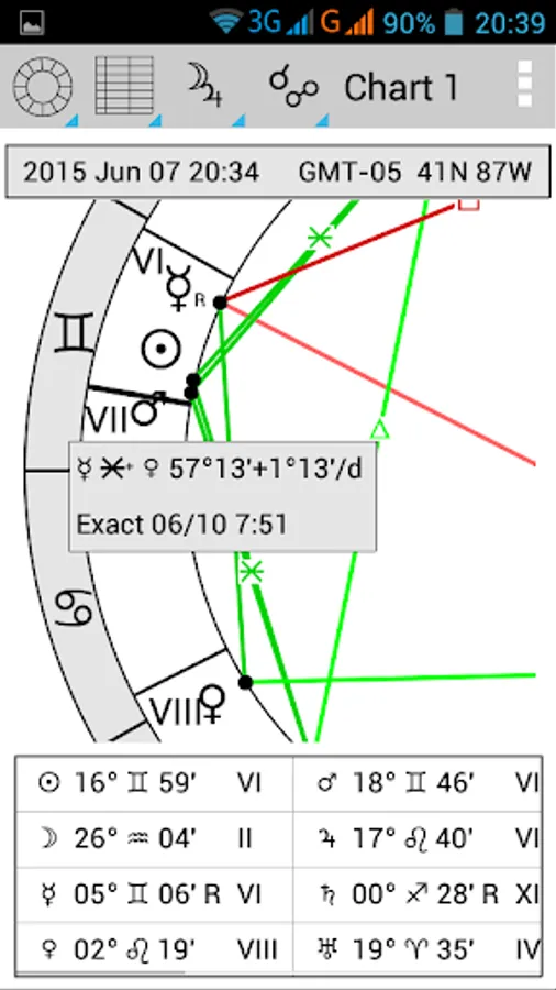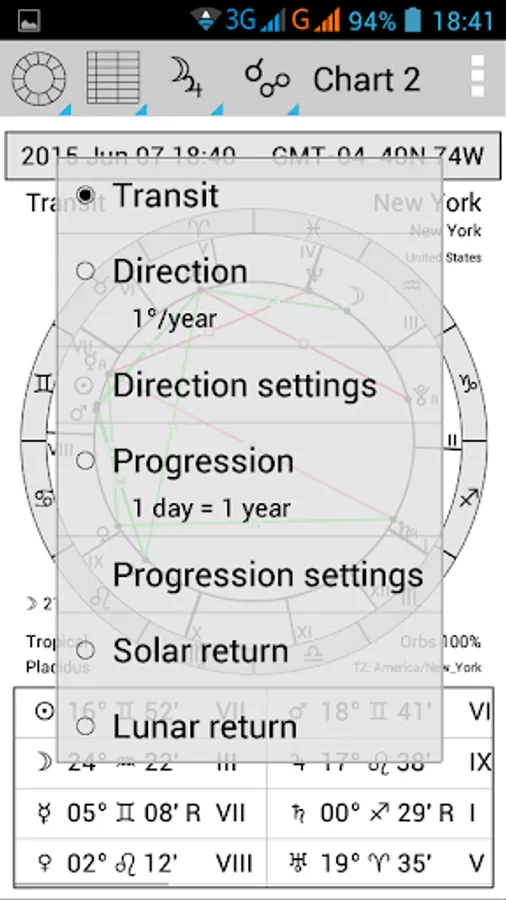 Full version is activated by subscription with automatic monthly paiment (until you cancel it at any time in Play Store; 7 days free trial period), or by a single payment for one year (no automatic payment). It can work with two charts, the core chart (Chart 1) which is a natal chart or an arbitrary time, and background chart (Chart 2) which could be natal (synastry), transit, return, direction/progression chart.