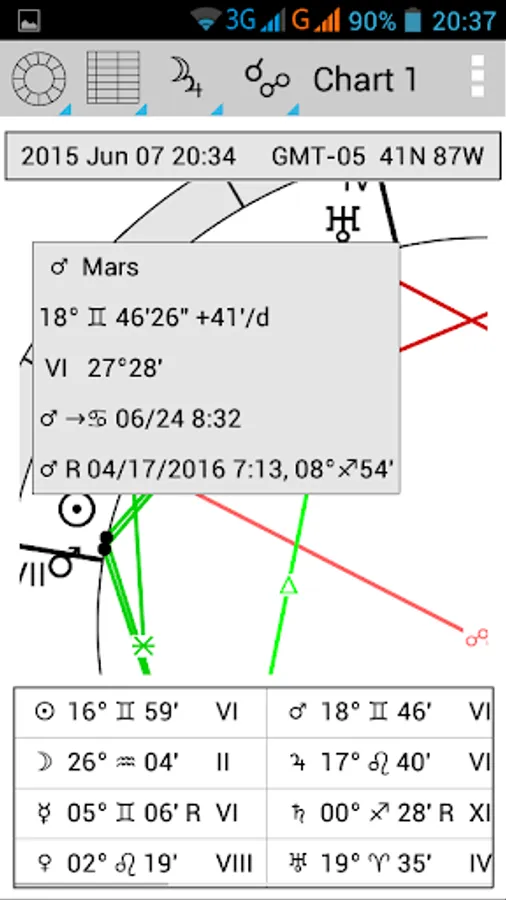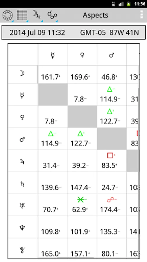 - Ingressions of planets, time of exact aspects (touch the planet sign or aspect line);