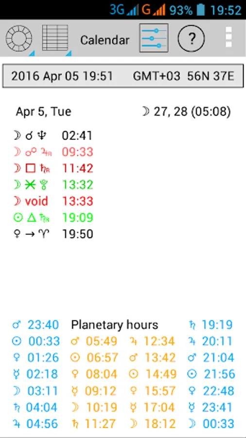 - Calendar of aspects and ingressions for the period of 1 day, 1 week, 1 month. It works also for directions and progressions.