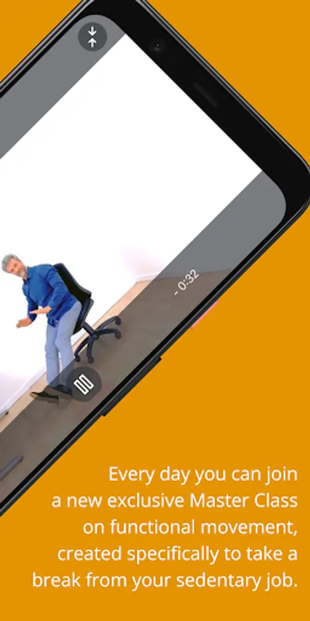 The only app to take care of your health even when you're working, at home or at the office. Every day, without moving away from your desk, you can join a new exclusive Master Class on functional movement, created specifically to take a break from your sedentary job.