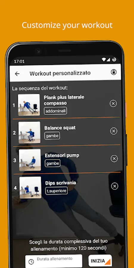 Organize your training session just the way you want it! We offer you over 200 extraordinary exercises: you only need your desk and your chair, no extra tools. You select the activities, decide your sequence and set the stopwatch with the duration of your training.