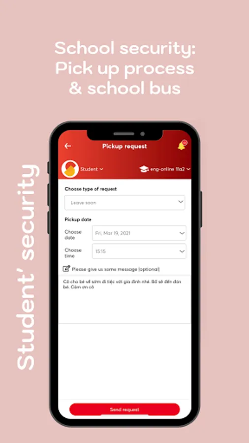 Request early pick-up - leave late: send your pick-up request early or late according to the parent's chosen time frame
